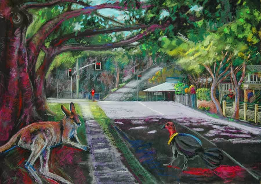 Another scrub turkey. This image has turned into a bit of a fantasy with the street scene and the animals added! It is actually Haig Road looking towards Heussler Terrace. Again the giant Moreton Bay Fig Trees. The purple shadows against the glare of the road were what initially motivated me with this one. I still visit Lone Pine Sanctuary fairly often and this kangaroo is one of my mates.